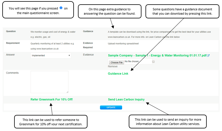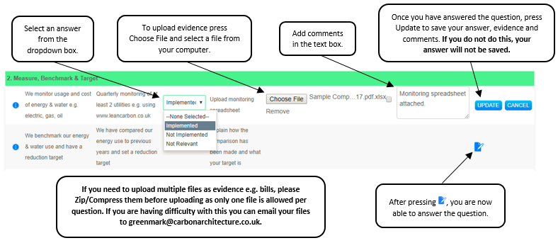 - When attaching evidence please name it in the format <Company – Audit – File Name>. To attach multiple pieces of evidence for the same question these will need to be zipped/compressed before uploading, only one file is allowed per question. If you are having difficulty with this, you can alternatively email the evidence to greenmark@carbonarchitecture.co.uk along with the question and audit name.