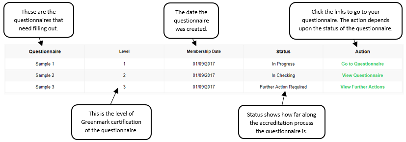 - The action depends upon the Status of the questionnaire, which shows the questionnaire’s progress through accreditation.