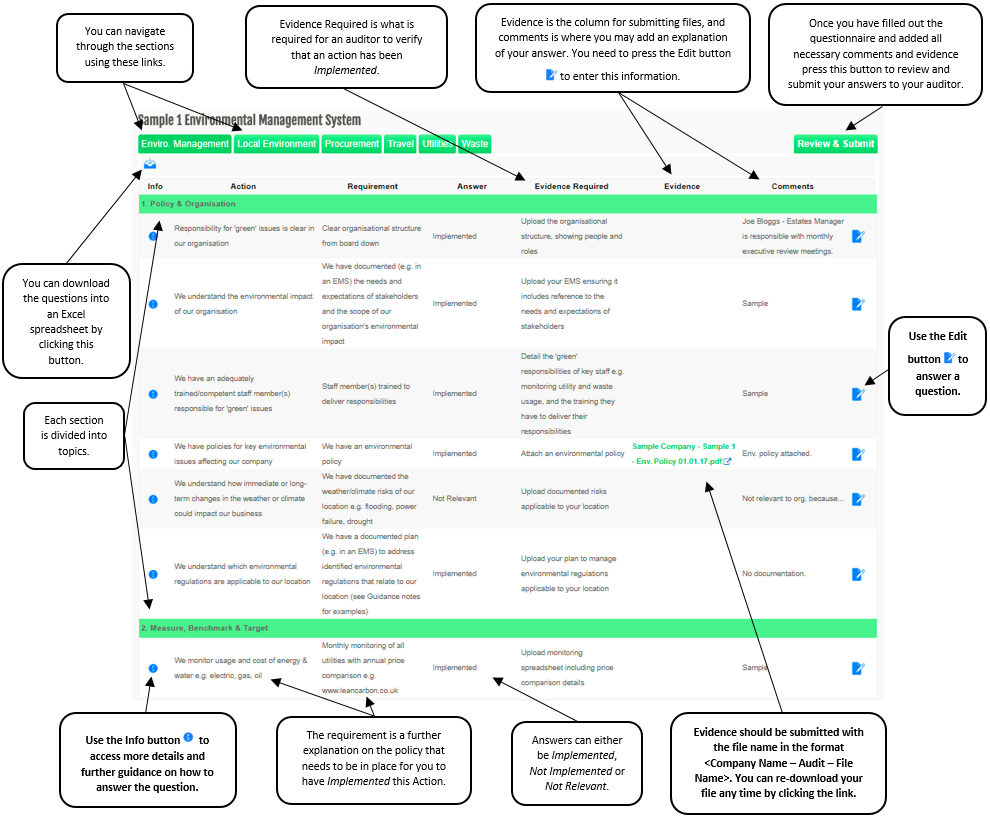 , a details page will appear with a Guidance section providing full explanation of the question and evidence required. - When you feel you have completed your questionnaire, press the Review & Submit button to go to the submission screen.