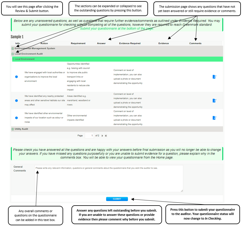 - Having pressed Review & Submit you will see this page. This shows any questions requiring further evidence or comments.